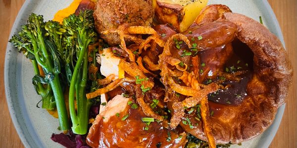 A choice of striploin beef, belly pork, bone in chicken supreme, mushroom and cauliflower wellington, crispy roast potatoes, sausage meat stuffing, tenderstem broccoli, savoy cabbage and wilted greens, braised red cabbage, carrot and swede puree, homemade Yorkshire pudding and of course gravy.